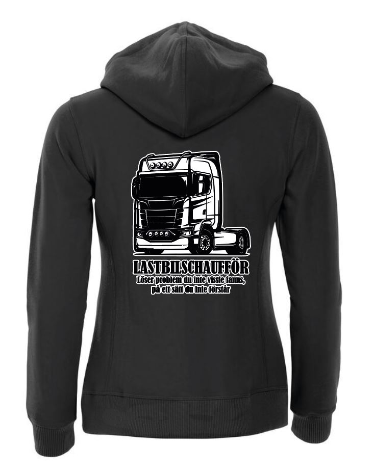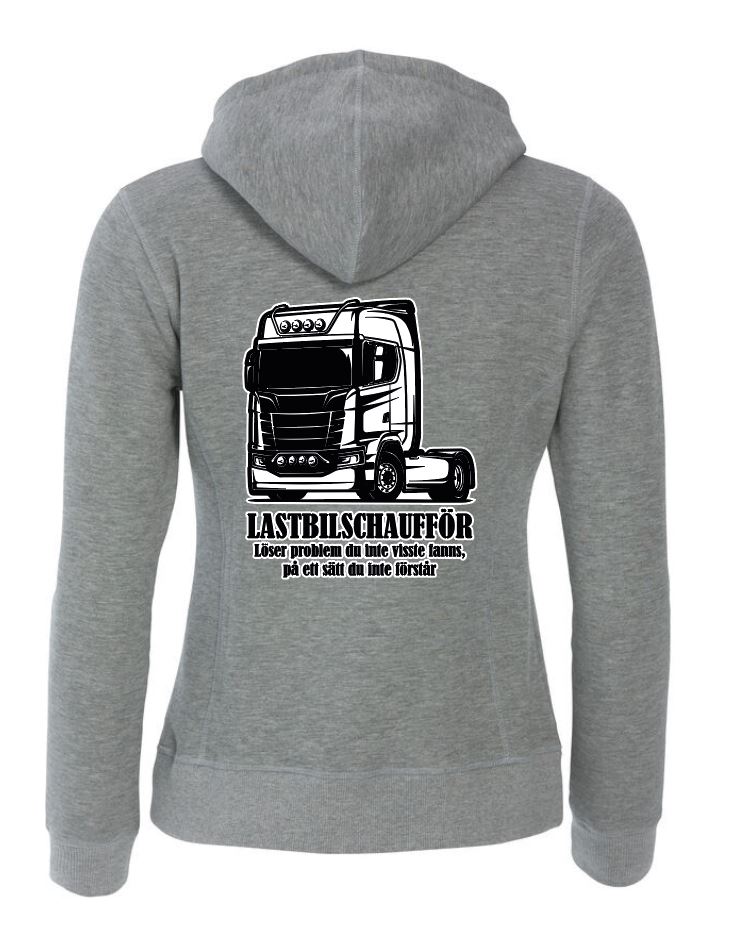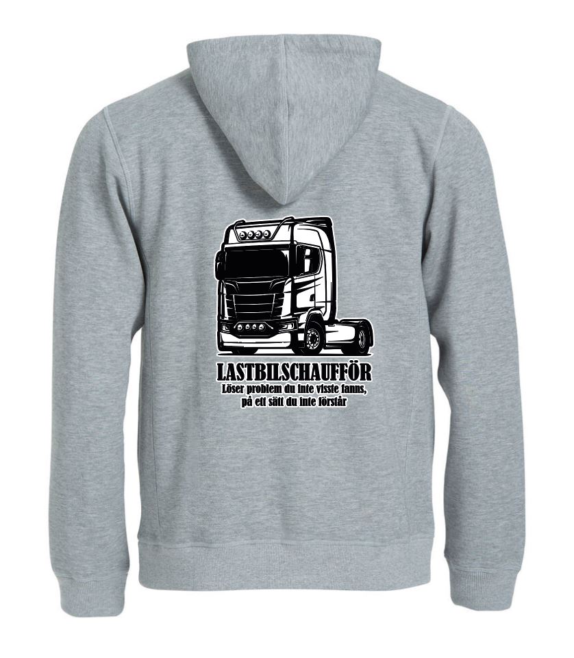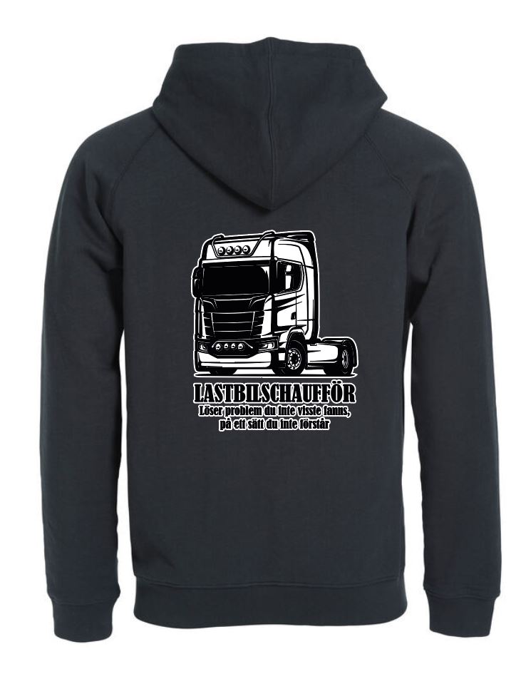 Bekväm Hoody med ryggtryck, trucker-motiv med ett klassiskt chaufförs-citat, tillsammans med den snygga Profil 32 loggan på ena armen